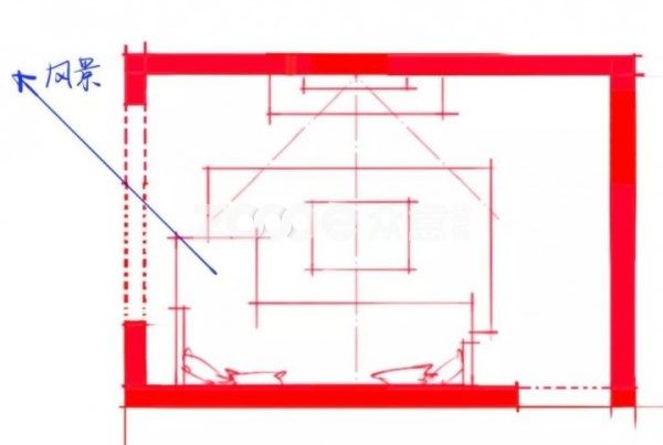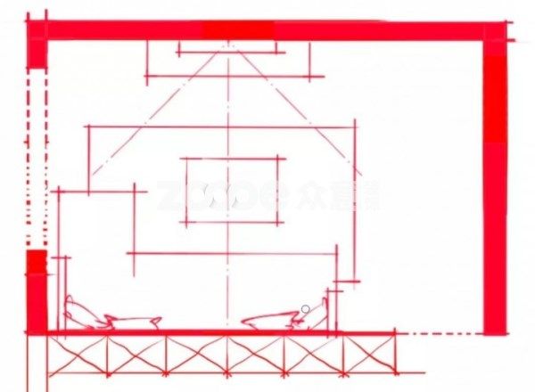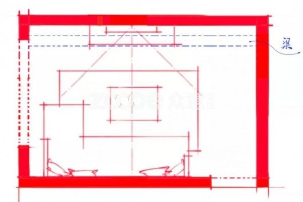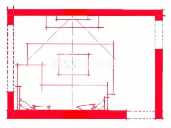 如上圖,當長墻一側(cè)上方有較高的梁的話,那么也是不適合擺沙發(fā)的,因為這樣會讓坐在沙發(fā)上的人感受到壓抑。