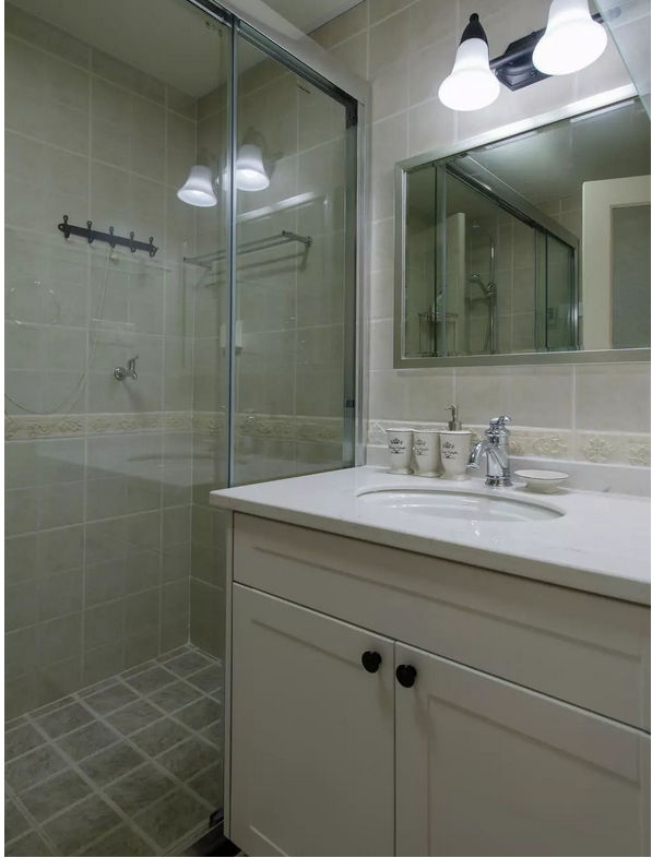 衛(wèi)生間也是采用白色系列臺盆與淡青色的瓷磚整個(gè)空間干凈整潔