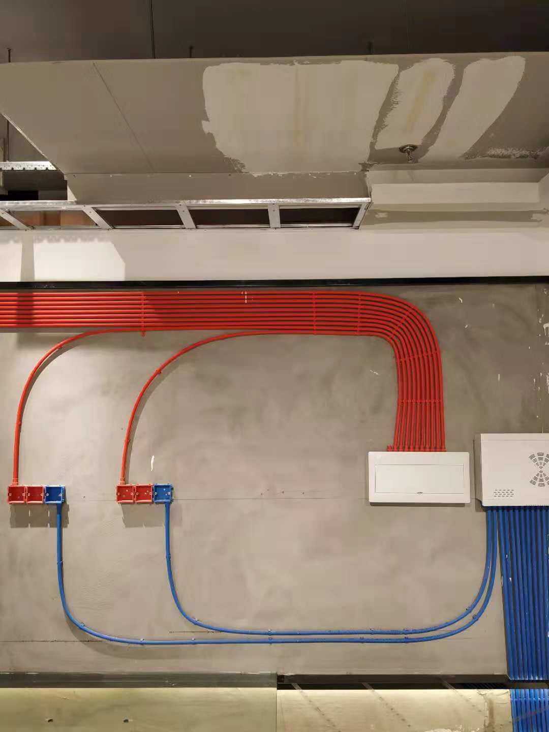 電路規(guī)劃過程中,紅色線管為強(qiáng)電線管走天,藍(lán)色線管為弱電線管走地,排列講究大灣工藝,這樣做既美觀也有效避免強(qiáng)弱電干擾,也方便后期對電線的定位
