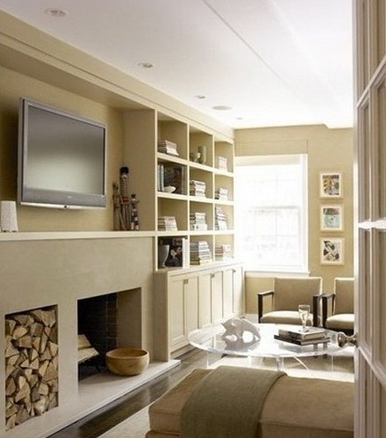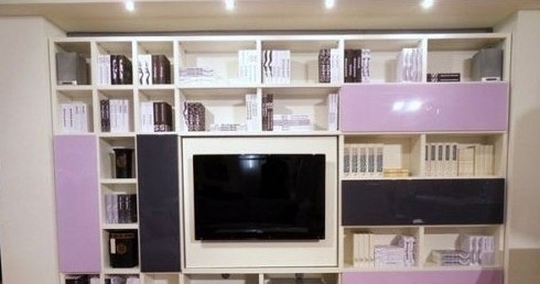客廳電視背景墻:以倒梯形形式,設(shè)計(jì)背景墻擱板,梯形頂端空缺位置嵌入電視,擱板上放書、裝飾品等,這樣的長形擱板,選擇幾款合適的書擋,尤為重要。