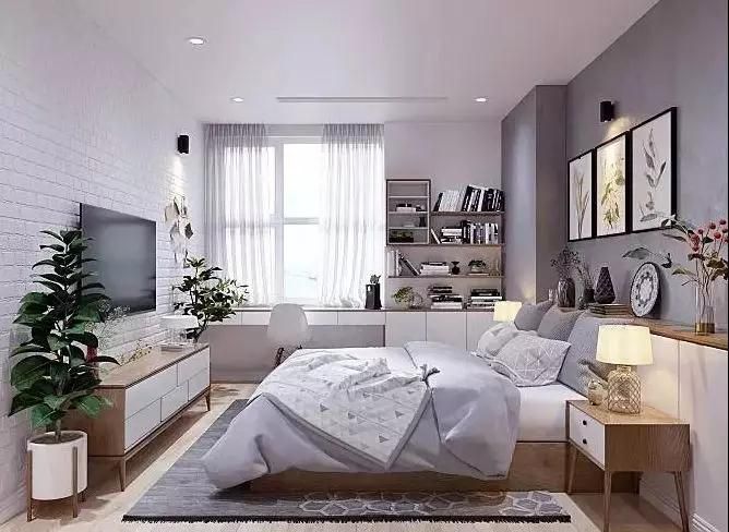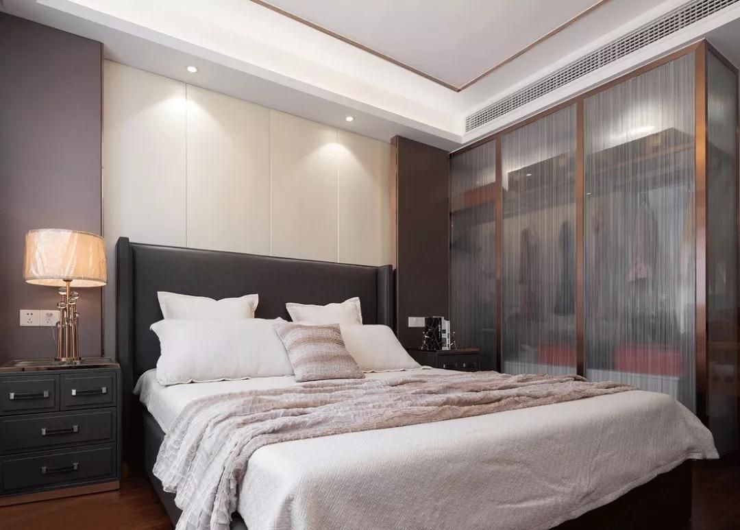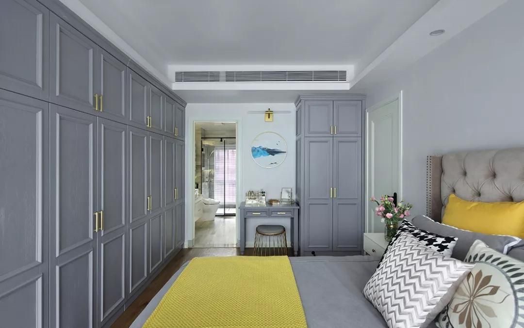 如果進(jìn)門處有衛(wèi)生間或是衣帽間,面積寬裕的臥室可以將中央空調(diào)的吊頂和衣柜一起設(shè)計(jì),更加合理的利用起空間。