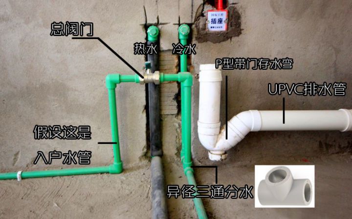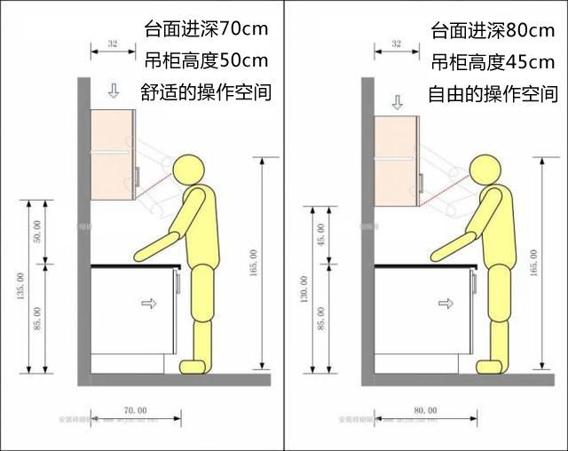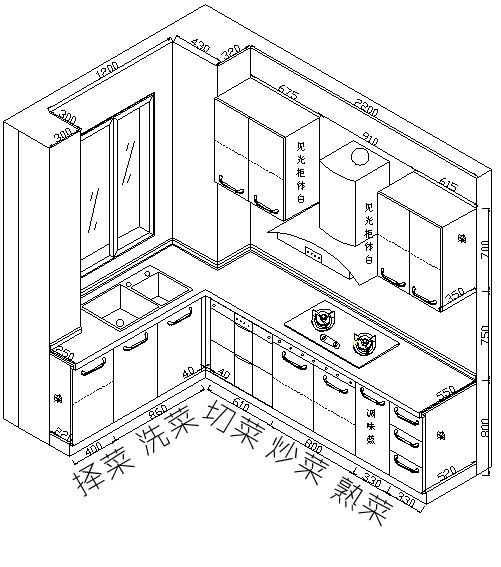 根據(jù)洗菜(水槽)→切菜(臺(tái)面)→炒菜(爐灶)按順序進(jìn)行排列,可以順時(shí)針,也可以逆時(shí)針。 如果位置充裕,可以升級成: 擇菜(臺(tái)面)→洗菜(水槽)→切菜(臺(tái)面)→炒菜(爐灶)→熟菜(臺(tái)面) 擇菜和熟菜的臺(tái)面最好在400mm以上。 尺寸規(guī)劃 分區(qū)所需尺寸參考 水槽區(qū):800mm; 切菜區(qū):600mm; 爐灶區(qū):900mm; 柜立柱:25mm/根; 其他區(qū):400mm; 臺(tái)面深度:520mm~650mm; 吊柜深度:320~350mm。 廚房有效長度至少2400mm能正常使用   如果家里煮飯的人不固定,可以統(tǒng)一臺(tái)面高度800mm,可能會(huì)產(chǎn)生下面的不足。 改善方案 臺(tái)面高度:炒菜臺(tái)面一般750mm舒適,洗切菜臺(tái)面一般875mm感覺舒適。 注:高低臺(tái)面的設(shè)計(jì)。也有不足,當(dāng)你想用水清洗燃?xì)庠钆_(tái)面周邊,不能痛快地把水推向水槽。 電器規(guī)劃 廚房三件套電器中,爐灶和油煙機(jī)房肯定是一起的,消毒柜建議放在切菜區(qū)。 注:燃?xì)庠钕路接羞M(jìn)氣口開關(guān),不能被消毒柜遮擋,現(xiàn)在很多廚房設(shè)計(jì)圖為了美觀都把消毒柜設(shè)計(jì)在爐灶下方,把氣閥放在另一側(cè),如果條件允許,實(shí)際規(guī)劃應(yīng)該盡量避免。 配件規(guī)劃 拉籃和碗籃都是提高廚房利用率的利器。 安裝調(diào)味籃預(yù)留位置,可以參考下面尺寸。 如需碗籃,可以參考下面尺寸 水電規(guī)劃 洗菜區(qū)水路規(guī)劃 水路規(guī)劃分為給水和排水。 給水里面走的是干凈的自來水,排水里面走的是生活污水。 給水(PPR管):一般進(jìn)戶水閥開發(fā)商都會(huì)預(yù)留在廚房,用三通分出水槽和其他地方用水管道,左熱右冷間距200mm,有吊頂?shù)脑捤芸梢宰咛臁?排水(UPVC管):在公共排水管道利用彎頭和水管接出到水槽下方。