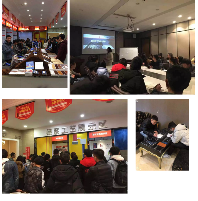 隨后付總向大家講解了佳天下整裝模式的優(yōu)勢以及與其他模式的區(qū)別;物料部經(jīng)理向大家展示了我們的材料類別、品牌等;工程部總監(jiān)李總為大家介紹了家裝施工流程和佳天下特殊的工藝技術(shù)。