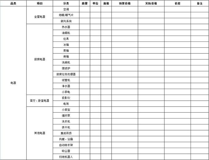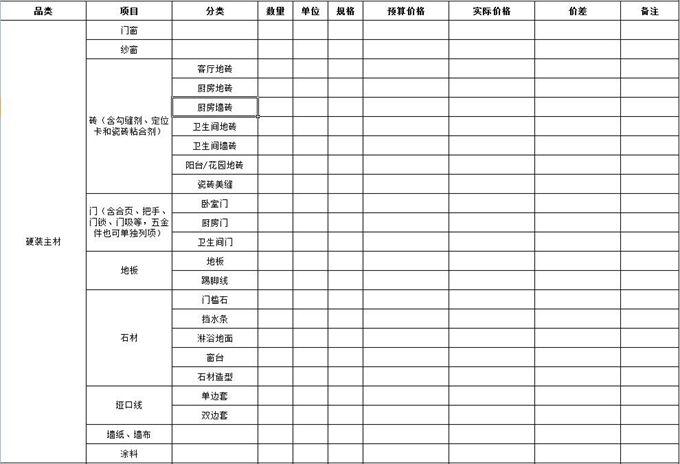 首先確定哪些裝修材料是你需要購買的,越詳細(xì)越好,盡量涵蓋所有家裝材料項(xiàng)目分類。比如以下項(xiàng)目。