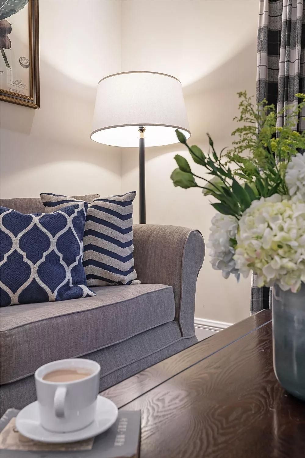 沙發(fā)一側(cè)的角落里設(shè)置一盞簡約落地?zé)?,營造出放松而有格調(diào)的氛圍。