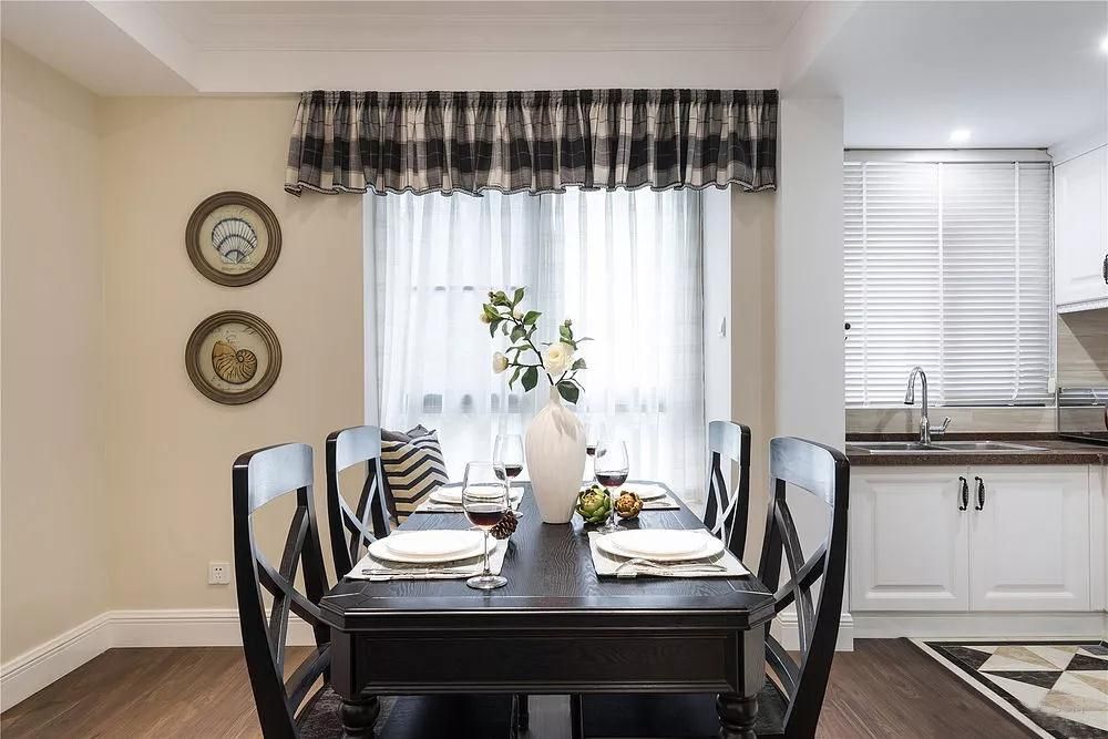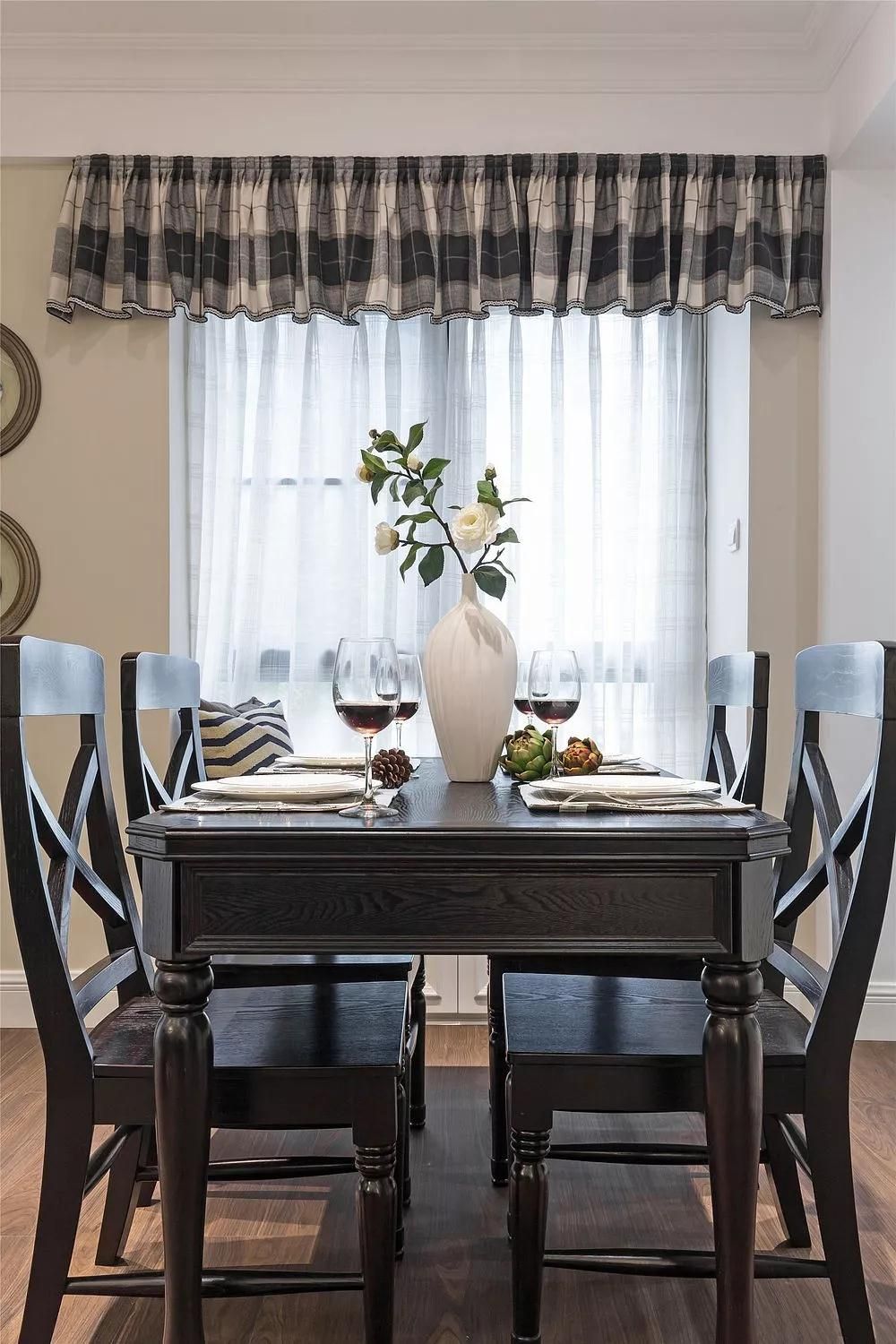 餐廳,深色實(shí)木餐桌椅質(zhì)感滿滿,與同為深色調(diào)的窗簾幔頭呼應(yīng),豐富了空間色彩的同時(shí),增強(qiáng)了層次感。