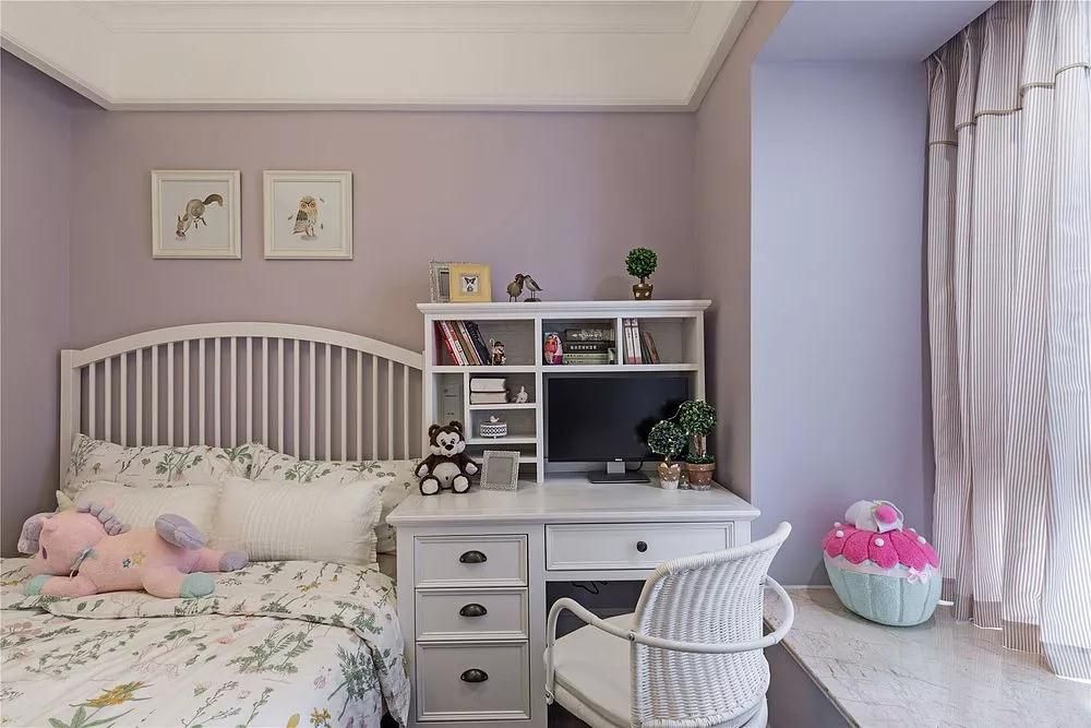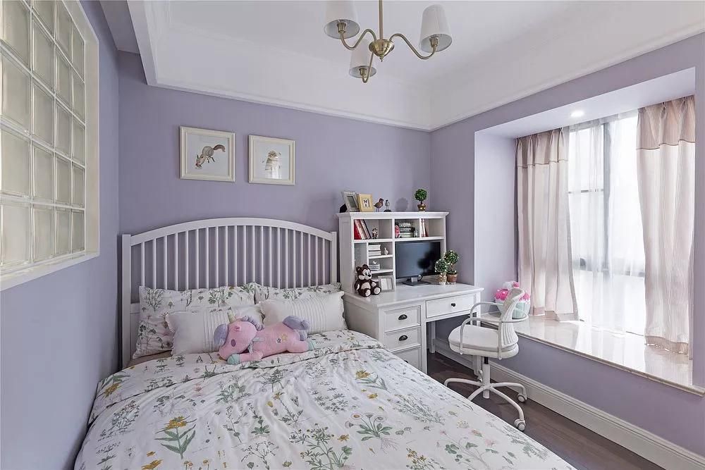 兒童房顏值超高,整體的色彩搭配雅致又不失活潑。淡淡的紫色,配上碎花床上用品,整體清新又明亮。