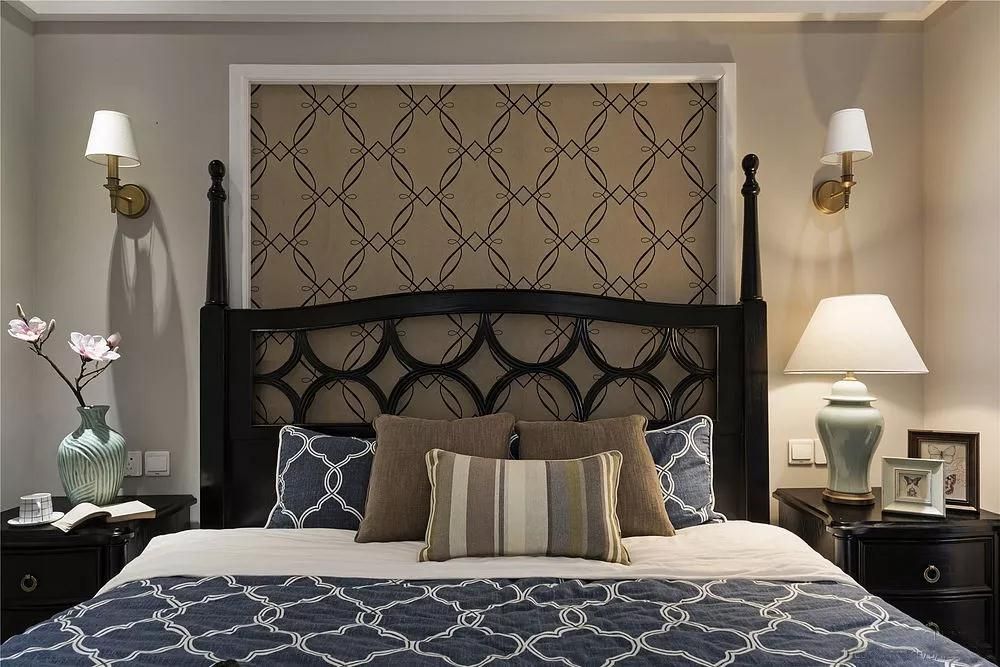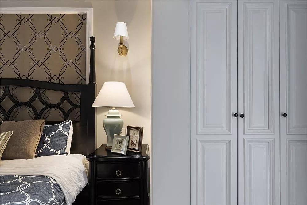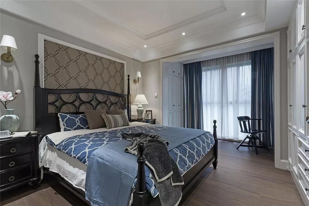 主臥,深色木質(zhì)的美式大床與床頭柜沉穩(wěn)而有質(zhì)感,配以舒適雅致的床品,提升了家居品味。