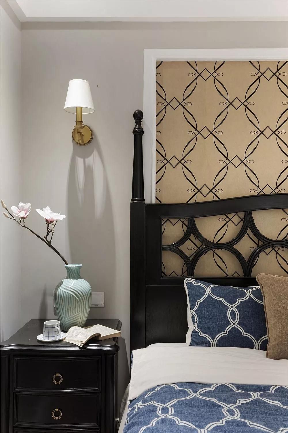 鏤空的床頭設(shè)計(jì)展現(xiàn)獨(dú)有的韻味,和背景墻紙相映成趣。 床頭兩側(cè)的木質(zhì)床頭柜擺上清新的花束與小擺件,帶來一份恬淡安逸的氣息。