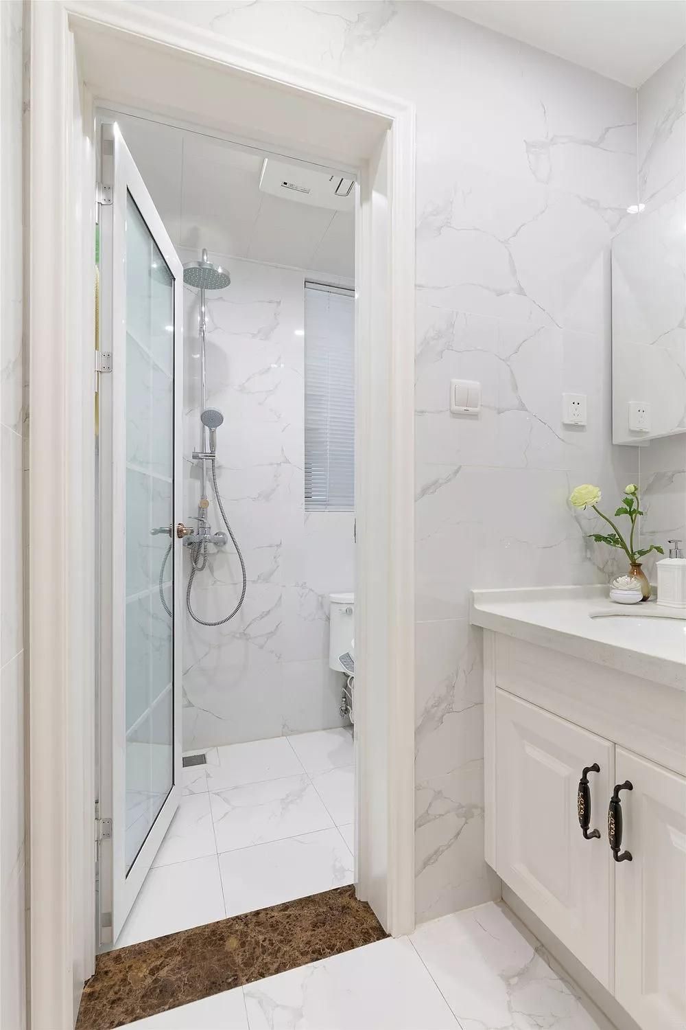 衛(wèi)生間墻地面通鋪大理石紋路的瓷磚,簡約而清冽。干濕分離的設(shè)計(jì)有效防止水汽散發(fā),提高日常使用效率。