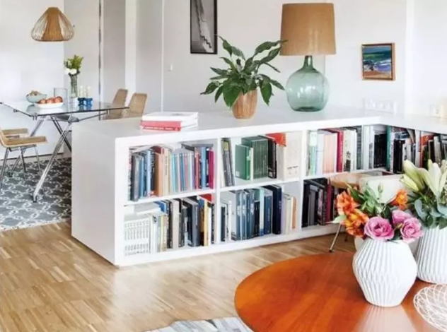 餐廳和客廳之間放個(gè)矮柜也能藏書。伸手想拿遙控器?還是先看幾頁書吧!