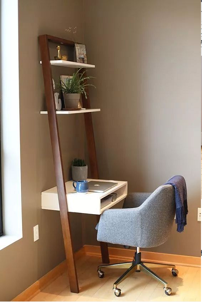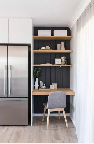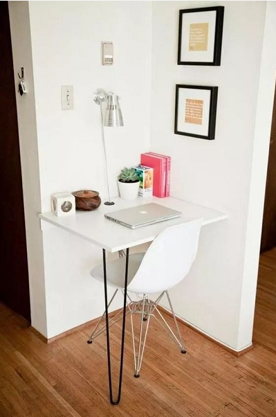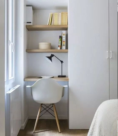因?yàn)槌叽鐔栴},房間即使定制裝修,也難免出現(xiàn)沒利用好的死角,利用小桌板+擱板架,就能將空間榨到極致。