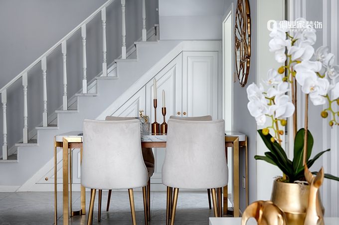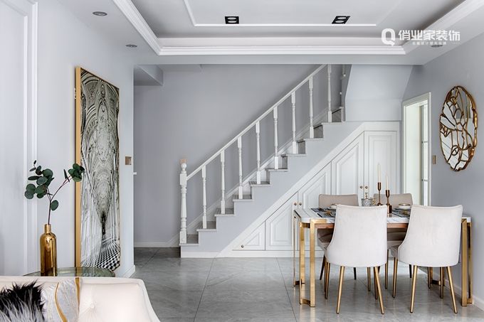 餐廳比鄰客廳,光線充足,不論身處餐廳還是客廳,都可以感受到愜意的生活氛圍。同時,為了保證空間的舒適度,并沒有設(shè)置酒柜或置物架,而是依靠樓梯下方有超大儲物功能,解決了戶型短板,也滿足了家庭實用性。