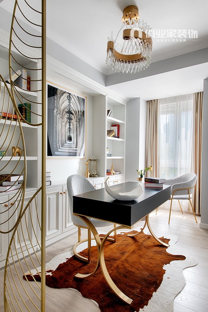 剛踏上二樓,就可見這個開放式的書房,不大卻十分精致。設(shè)計師吳萱原創(chuàng)設(shè)計的隔斷樣式,古銅色的金屬線條裝飾成嶄新的隔斷,獨一無二。開放的空間,精致的家具,時尚的獨椅。。。拿本書就可以從辦公狀態(tài)切換到閱讀時間,享受生活。