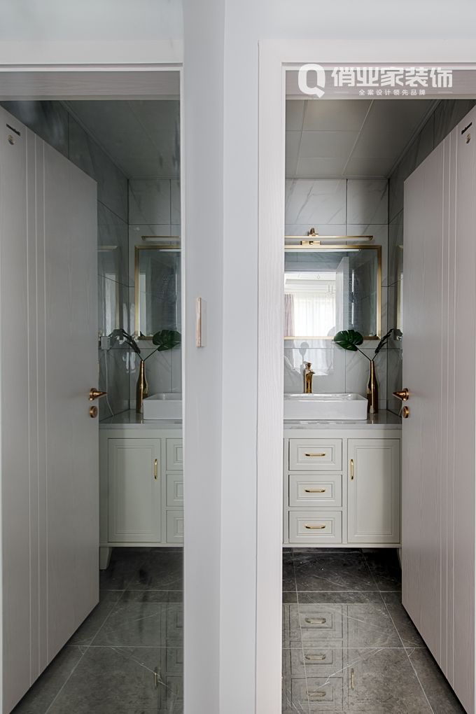 設(shè)計師吳萱考慮到現(xiàn)代居家簡約的生活方式,也為了保留那份輕松的姿態(tài)。所以,整屋墻面勾勒了整齊的石膏線條增加法式裝潢效果的層次感,白色和金色搭配則非常優(yōu)雅 ,結(jié)合藍(lán)灰淺色的墻面讓空間變得更加溫柔。