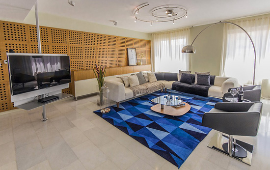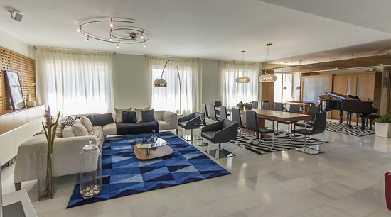 編輯點(diǎn)評(píng):公寓采用開放式的空間設(shè)計(jì),賦予室內(nèi)寬闊的視野范圍和明亮舒適的家居環(huán)境,曲線優(yōu)美的吊燈和落地?zé)舾行У孛阑丝臻g質(zhì)感。