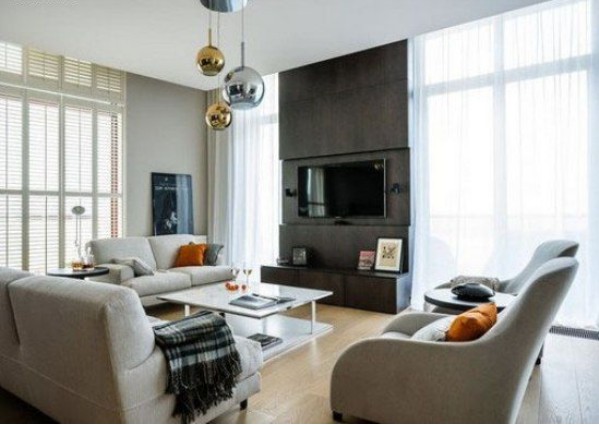 極富規(guī)劃感的吊頂規(guī)劃,細看周圍的一圈和墻面是分隔的,就像是浮在客廳上方一樣。淡色的木質地板和周圍豁亮的環(huán)境想照應,兩面墻都采用了落地窗的款式,整個空間都變的亮堂、通透?;液谏碾娨暠尘皦η对诼涞卮爸?。