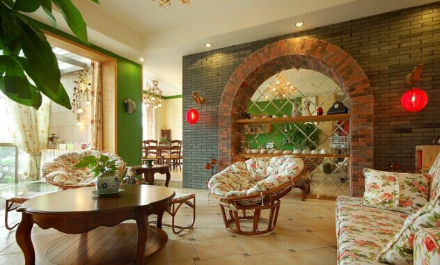 壁紙多選用純紙漿質(zhì)地,布藝也是美式鄉(xiāng)村風(fēng)格中重要的運(yùn)用元素,本色的棉麻是主流,布藝的天然感與鄉(xiāng)村風(fēng)格能很好地協(xié)調(diào);各種花卉植物、異域風(fēng)情飾品、搖椅、小碎花布、鐵藝制品等都是鄉(xiāng)村風(fēng)格中常用的東西。